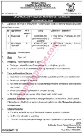The Government of Sindh announced vacancies as a psychologist and a microbiologist technician in Rangers Sindh. These vacant positions are purely on a contract basis. The vacant positions are as follows: