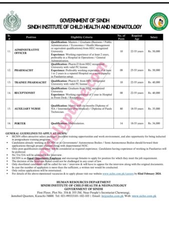 Sindh Institute of Child Health & Neonatology is seeking self-motivated and enthusiastic individuals with domicile, preferably in Sindh province, for the following positions: