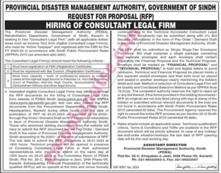 Interested eligible consultant legal firms can download the RFP documents from the website www.pdma.gos.pk. For further information, see the advertisement below: