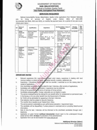 The Government of Pakistan National Account Bureau (NAB) recently announced jobs in the Balochistan branch. Intrigued candidates are required to apply before the deadline. The details regarding the jobs are below: