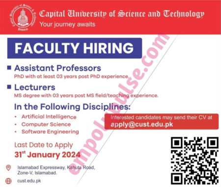 Capital University Science & Technology is looking for passionate, experienced, and dynamic faculty members. Start your journey with Cust as a faculty member in the following disciplines:
