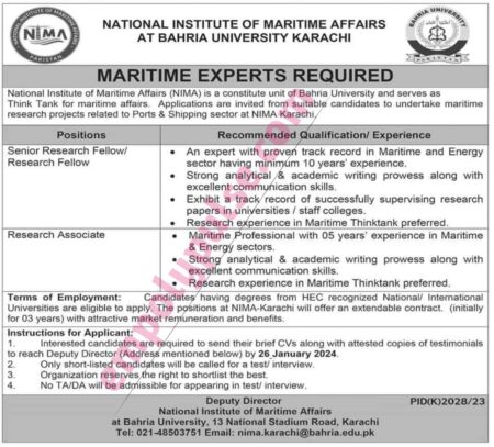 Maritime Experts Required at Bahria University Karachi