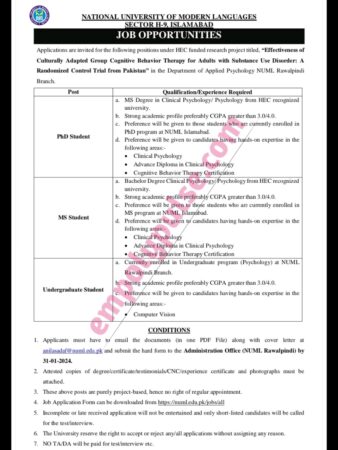 The Department of Applied Psychology at NUML Rawalpindi Branch is doing a research project named “Effectiveness of Culturally Adapted Group Cognitive Behavior Therapy for Adults with Substance Use Disorder: A Randomized Control Trial from Pakistan.” Applicants are invited for a HEC-funded research project.