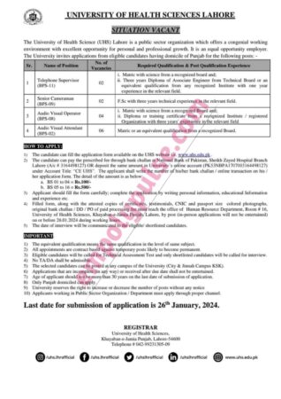 Candidates can fill out the application form on the UHS website, www.uhs.edu.pk. For further details, see the advertisement below.