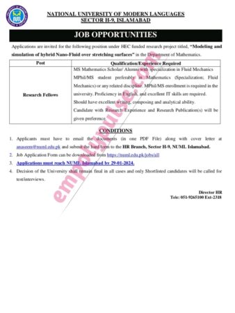 Intrigued candidates should apply before the last date of January 29, 2024. Applicants must send their PDF file documents to the email address anaseem@numl.edu.pk and submit their documents in hard form to the address given in the advertisement.