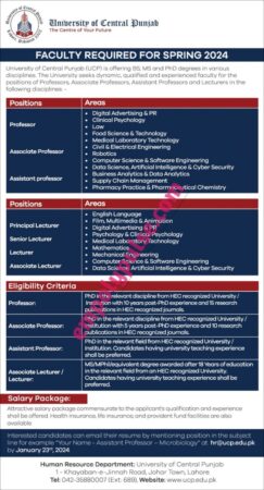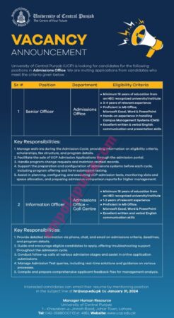 The University of Central Punjab recently published an advertisement for faculty required in admissions offices for the following posts: Candidates who want to apply for the following posts must submit their applications before January 31, 2024.