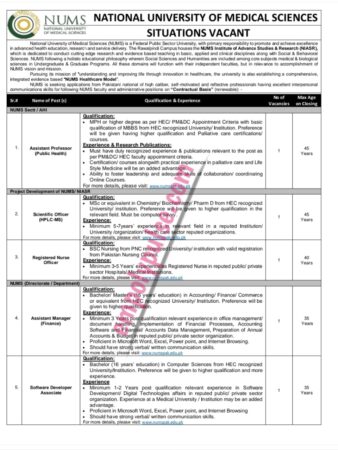 The National University of Medical Sciences (NUMS) recently announced jobs in the faculty department. A federal public university that promotes advanced education and research. Applications will be accepted for Pakistani national positions on a contractual basis. Applicants are invited for the positions of assistant professor, scientific officer, registered nurse officer, assistant manager (finance), software associate, admin supervisor, etc.