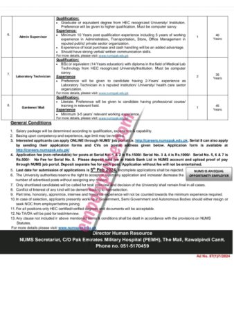 Interested applicants can apply online through NUMS, the job portal career.numspak.edu.pk. For further details, see the advertisement below: